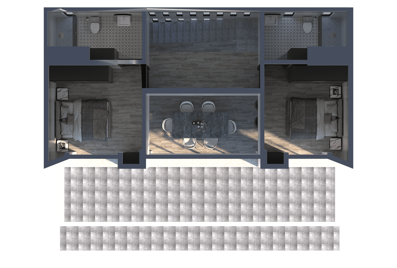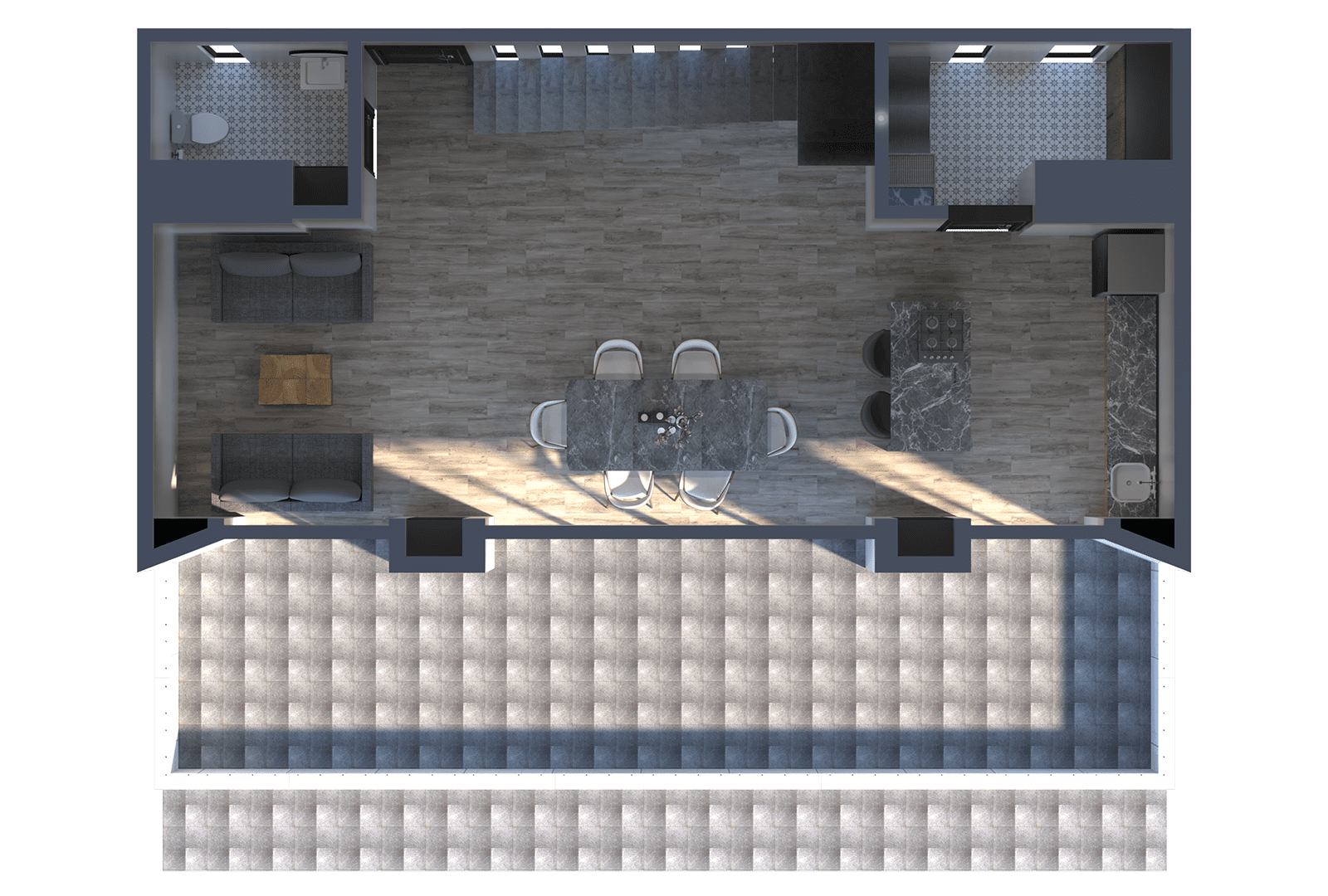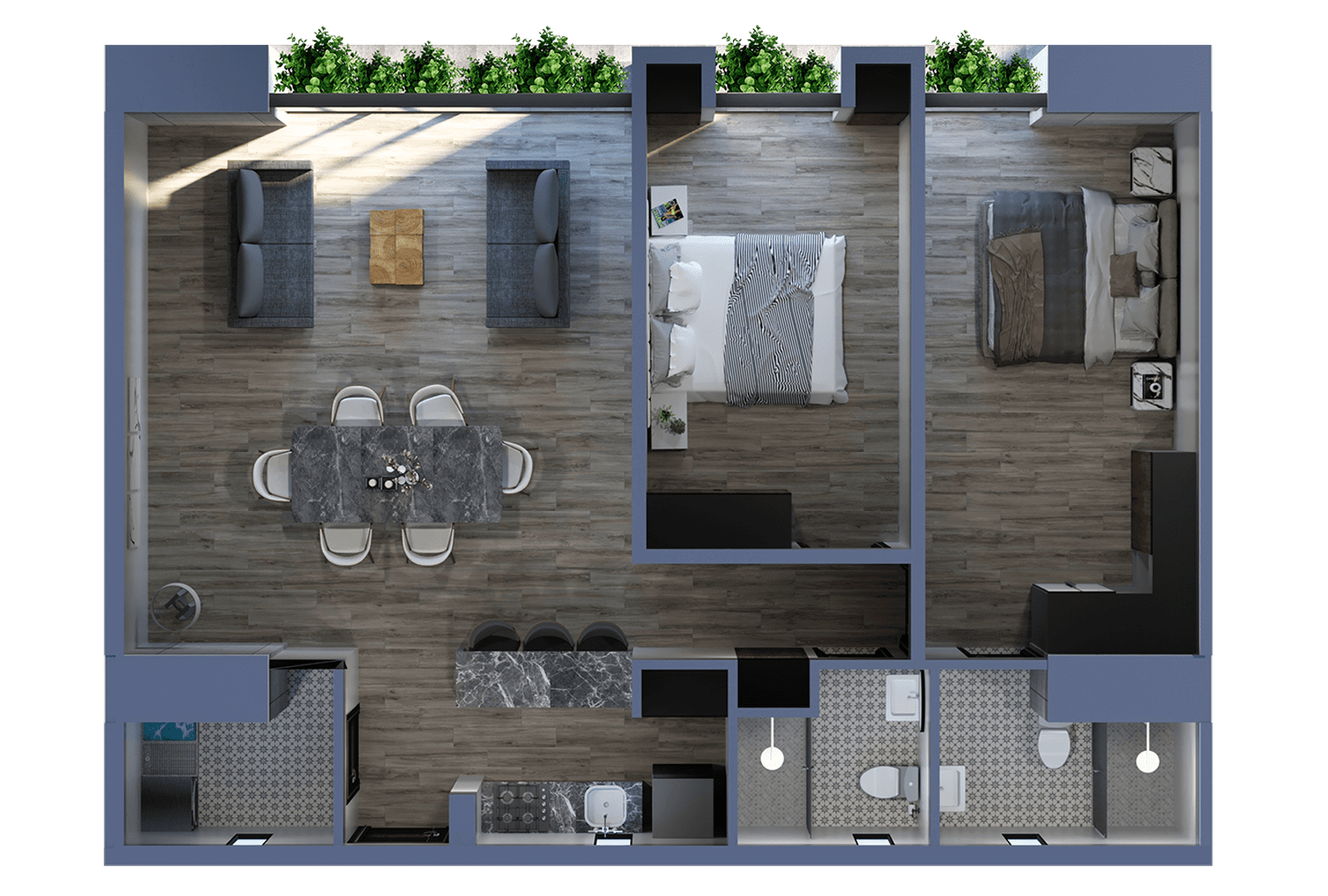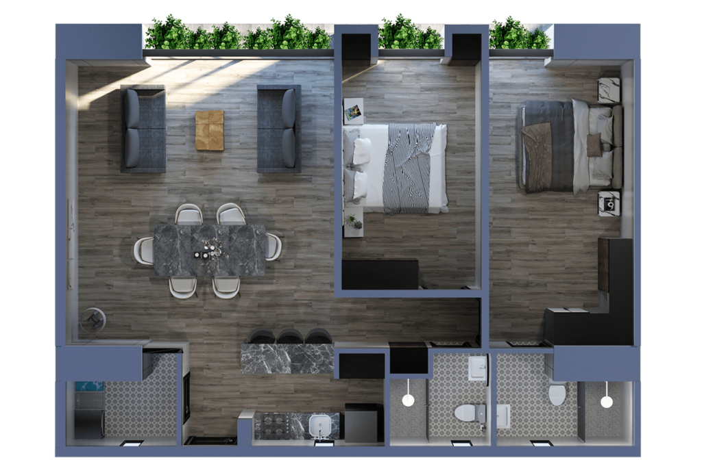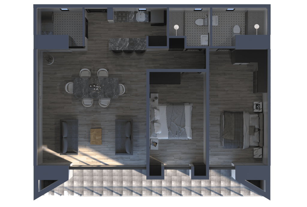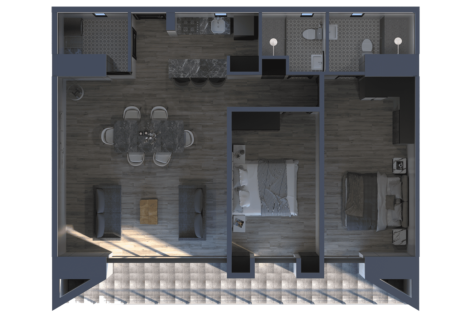 El departamento tipo 2, se encuentra en la planta tipo del nivel 1 al nivel 9 del desarrollo, cuenta con estancia, comedor, cocina, 1 baño general, 2 recámaras con closet, de estas la recamara principal cuenta con baño privado.